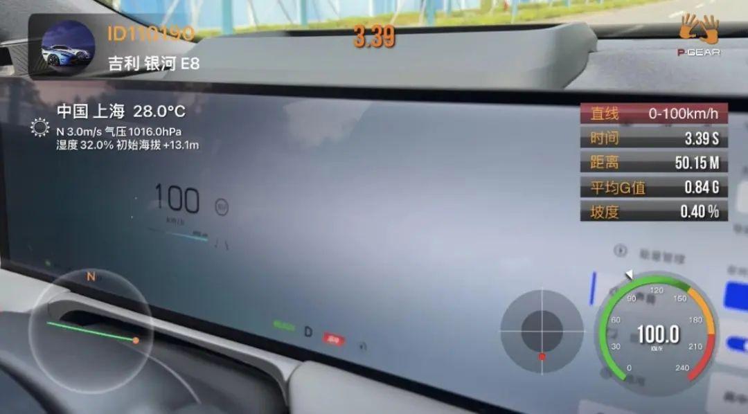 當然最直觀能體現性能的測試項目就是零百加速了,在我們的測試下,吉利銀河E8性能版的零百加速竟然超越了官方標定的3.49s,達到了3.39s的好成績,這樣的反向虛標誰能不喜歡!