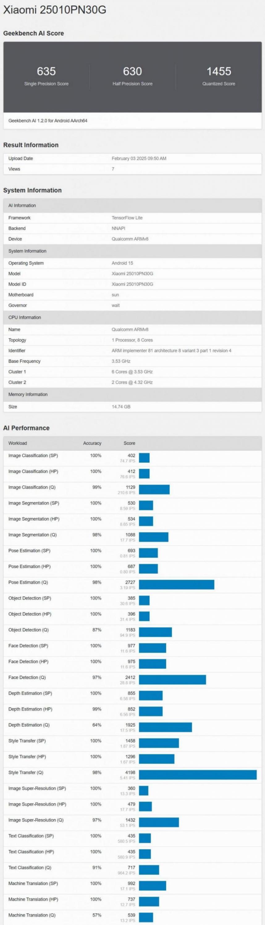 2 月 3 日,一款小米 25010PN30G 新機出現在了 Geekbench AI 跑分中,外媒 XpertPick 表示這是“小米 15 Ultra 的全球版”。該機搭載只有驍龍 8 至尊版才有的 Adreno 830 GPU。