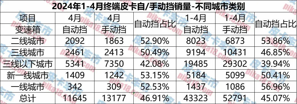 新一線城市自動(dòng)擋占比是最高的,而二線、三線和一線城市的自動(dòng)擋占比也都超過了50%,只有三線以下城市的自動(dòng)擋占比是低于50%的。這所自動(dòng)擋車型和城市的發(fā)達(dá)程度還是息息相關(guān)的。因?yàn)樽詣?dòng)擋車型的售價(jià)往往還是高于手動(dòng)擋車型。