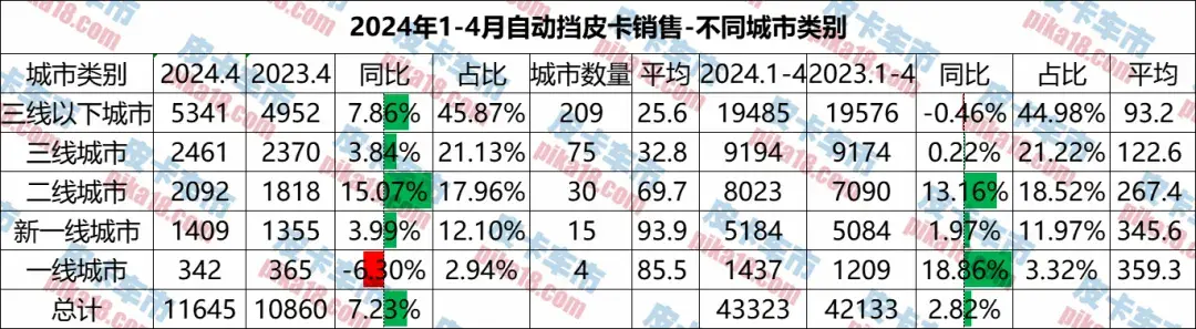 1-4月,自動(dòng)擋銷量增長最高的是一線城市和二線城市,但是4月單月一線城市同比又是唯一下降的。這說明一線城市的銷量不夠穩(wěn)定。綜合來看,二線城市處在一個(gè)穩(wěn)定的增長期。從平均數(shù)來看,一線城市、新一線城市和二線城市的自動(dòng)擋平均銷量是最高的。但是這個(gè)數(shù)據(jù)也要結(jié)合城市4S店的數(shù)量來看才更加有指導(dǎo)性。