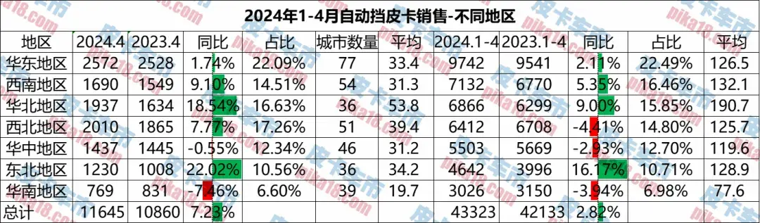 從不同地區(qū)來看,可以分成華東地區(qū)、西南地區(qū)、華北地區(qū)、西北地區(qū)、東北地區(qū)、華中地區(qū)和華南地區(qū)7大地區(qū)。從自動(dòng)擋占比來看,竟然是東北地區(qū)排第一。西南地區(qū)和華南地區(qū)排在最后兩位。而西北地區(qū)、華中地區(qū)和華南地區(qū)1-4月自動(dòng)擋則同比出現(xiàn)了下滑,東北和華北地區(qū)增長是最快的。華北地區(qū)城市的自動(dòng)擋平均銷量遙遙領(lǐng)先,達(dá)到了190.7輛,華南地區(qū)僅有77.6輛。這說明廣東、廣西和海南地區(qū)的自動(dòng)擋皮卡銷量不太理想。