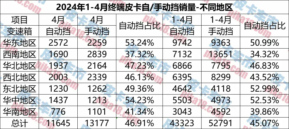 自動(dòng)擋皮卡的銷量越來越高,那么到底是哪些地區(qū)的消費(fèi)者更加偏愛自動(dòng)擋皮卡,又是那些地區(qū)更偏愛手動(dòng)擋呢?今天我們就來從地域的角度詳細(xì)分析一下今年1-4月自動(dòng)擋皮卡銷量的地域偏好。