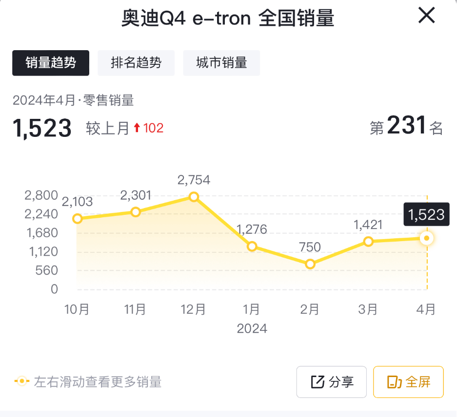 進入2024年之后,從1-4月份銷量表現來看,奧迪Q4 e-tron的銷量規模不僅沒有好轉,反而表現更為遜色。