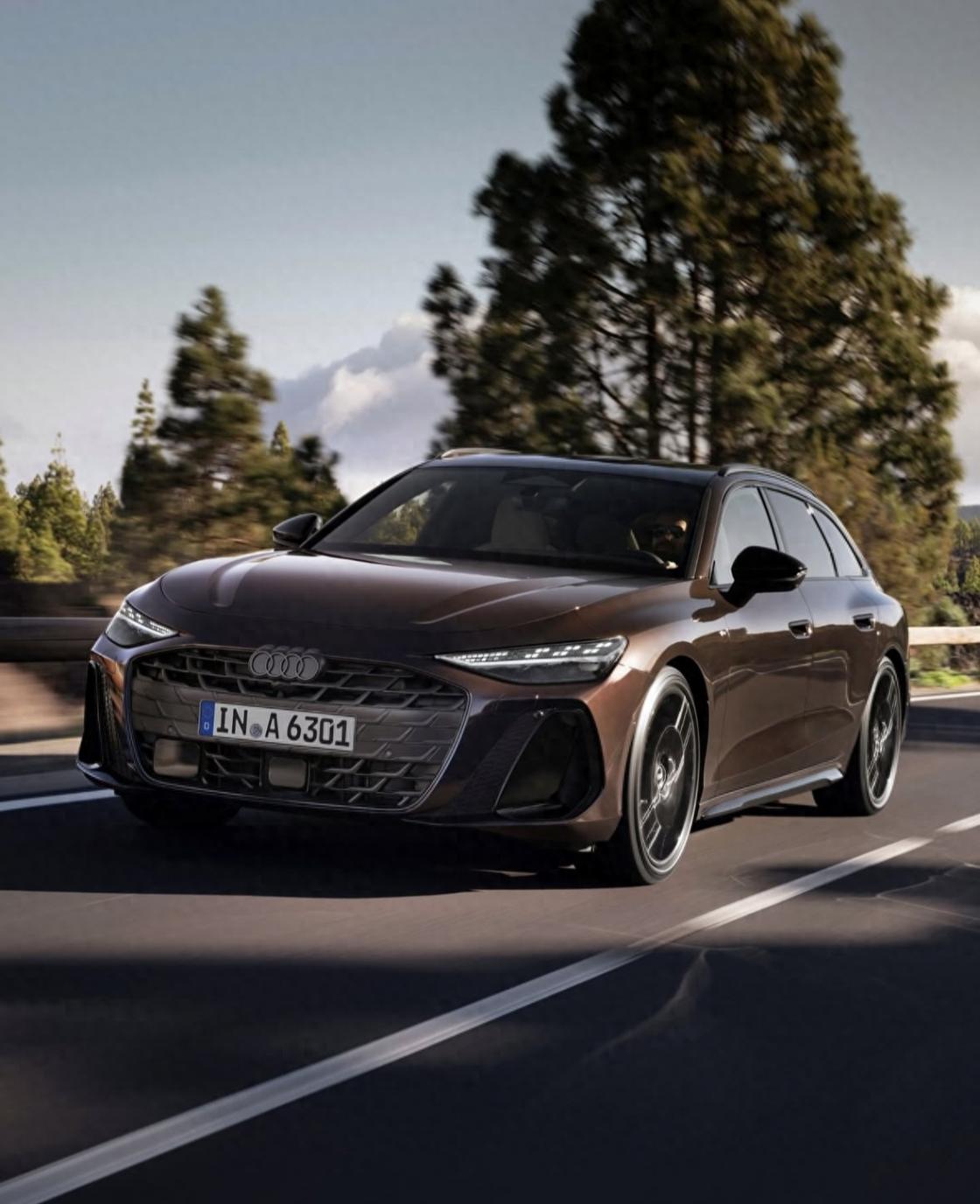 新車保留了奧迪標志性的六邊形中網,但通過黑化處理和可編程日行燈實現個性化表達,矩陣式光源支持動態圖案切換,兩側導流槽兼具空氣動力學與視覺沖擊力。側面修長線條搭配22英寸熏黑輪轂,D柱前傾角度增加至15°,風阻系數降至0.25,成為歷代最“滑”的A6旅行車。尾部貫穿式尾燈采用雙層鱗片光源,與熏黑擴散器共同演繹“西裝暴徒”美學。