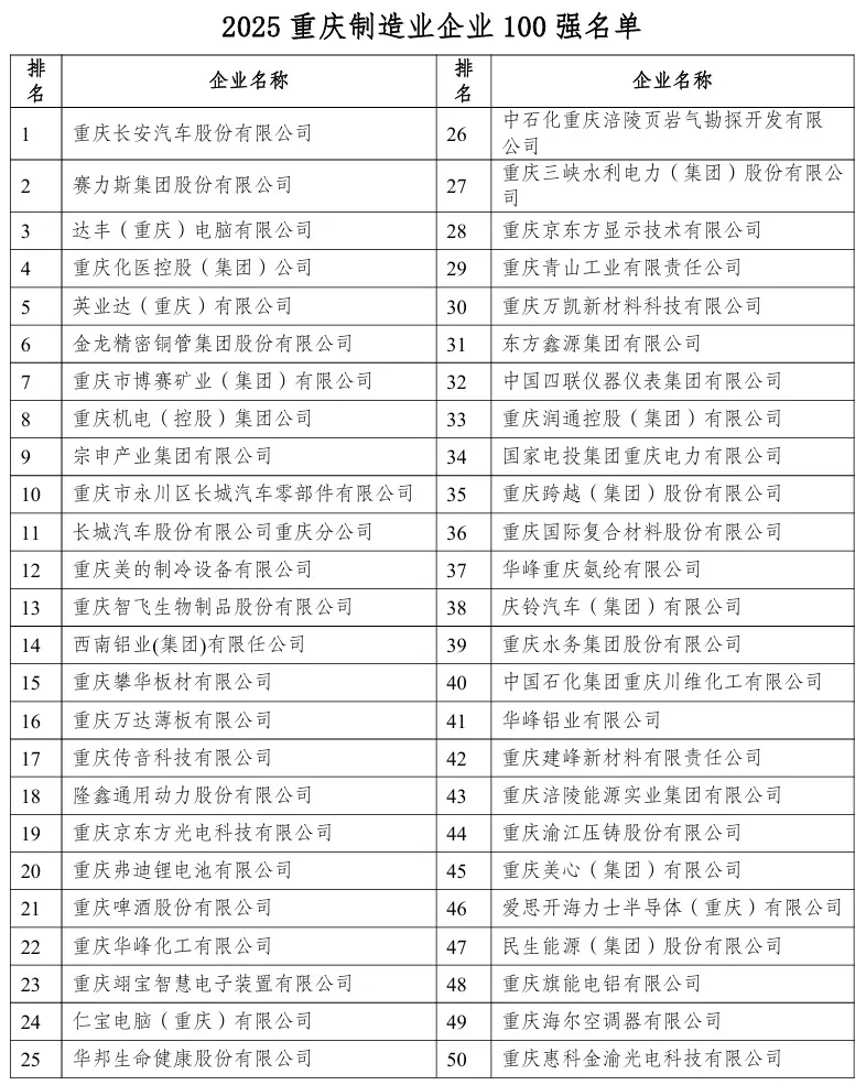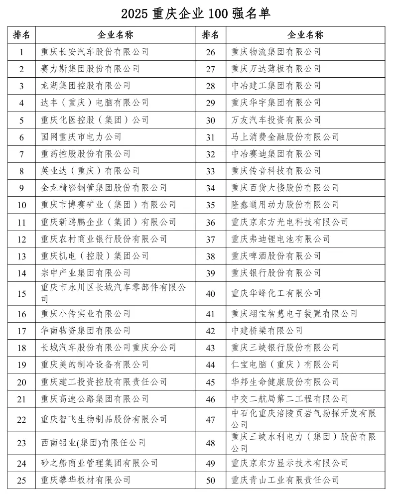 從名單獲悉,長安汽車、賽力斯、龍湖集團位列 2025 重慶企業 100 強前 3 位。