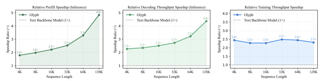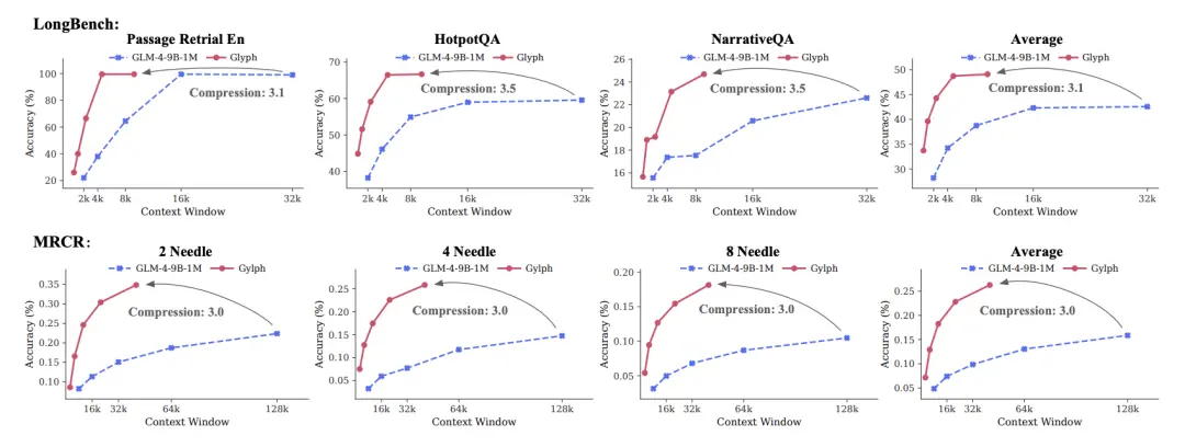 實(shí)驗(yàn)結(jié)果顯示,Glyph在多項(xiàng)長(zhǎng)上下文基準(zhǔn)測(cè)試中實(shí)現(xiàn)了3–4倍的Token壓縮率,同時(shí)依然保持與主流模型(如Qwen3-8B)相當(dāng)?shù)臏?zhǔn)確度。