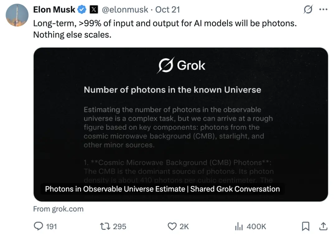 從長(zhǎng)遠(yuǎn)來看,人工智能模型的輸入和輸出中 99% 以上都將是光子。
